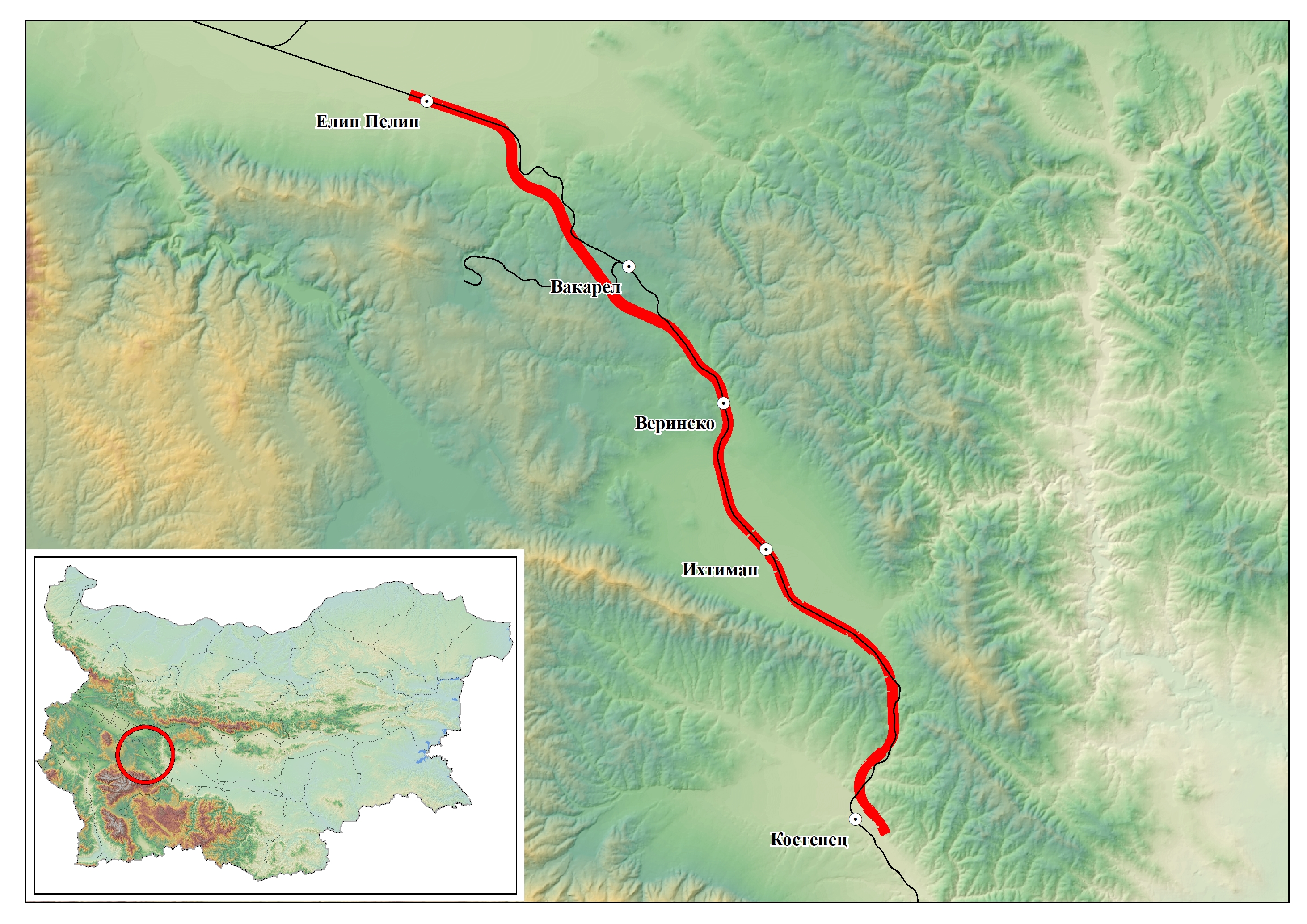 Изграждането на трасето е разделено на 3 участъка: Елин Пелин – междугарие след гара Вакарел, междугарие след гара Вакарел – междугарие след гара Ихтиман и междугарие след гара Ихтиман – нова гара Костенец.