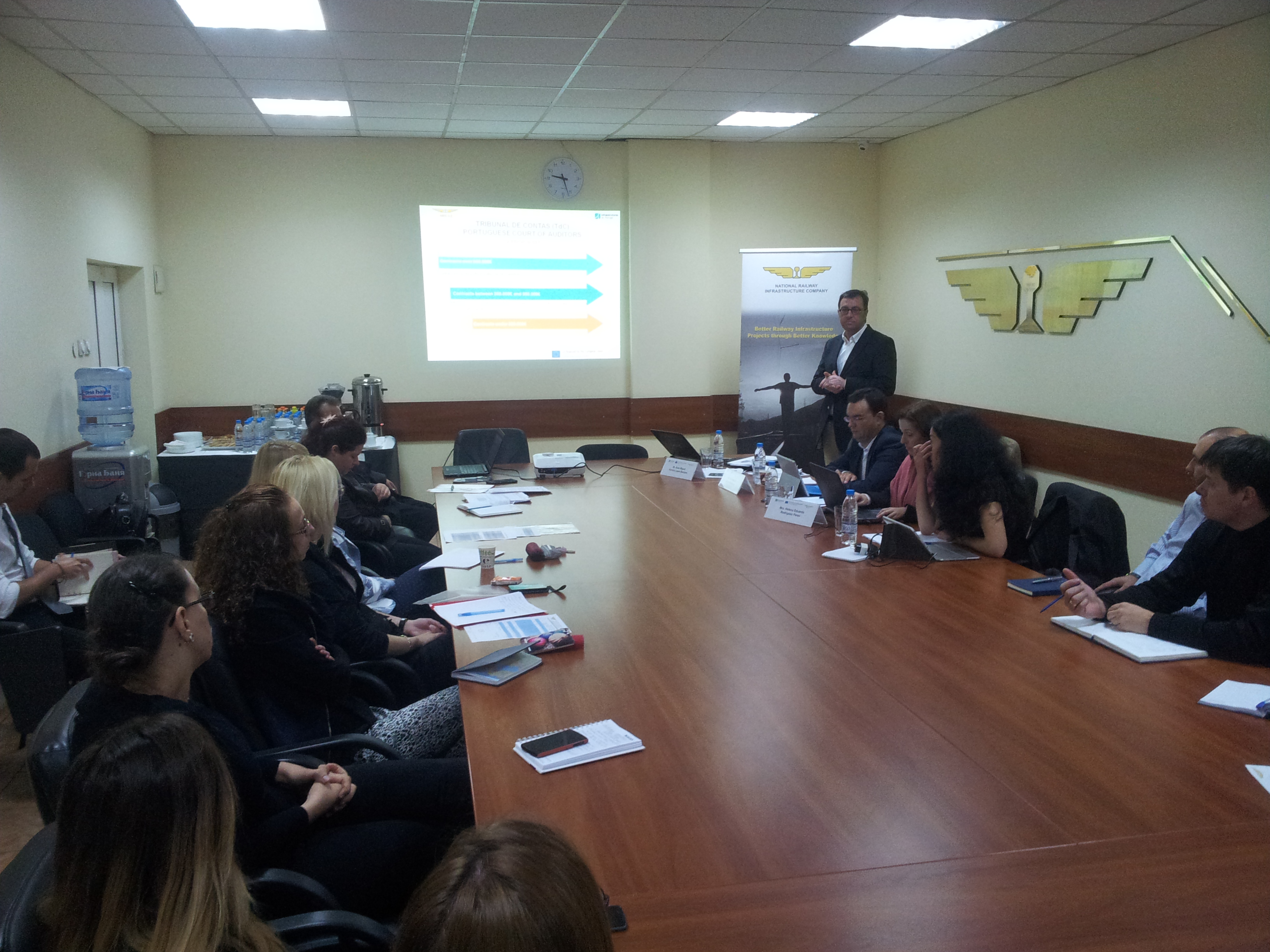 Португалските експерти се срещнаха с г-н Христо Алексиев, председател на Управителния съвет и с г-н Златин Крумов, заместник генерален директор „Експлоатация“ в НКЖИ. През двата семинарни дни пред по-разширен състав на служители от НКЖИ и гости от УО на ОПТТИ, под формата на презентации и дискусии експертите от УЖИ на Португалия представиха техния опит, научените уроци и добрите практики в сферата на управлението на инвестиционните проекти, финансирани от ЕС.