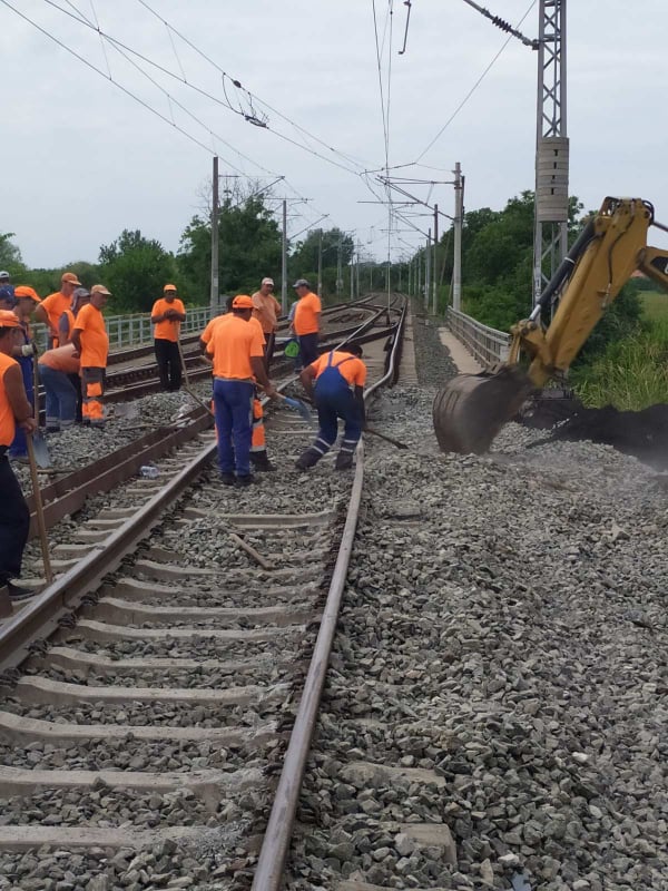 Продължават възстановителните дейности по железния път, контактната мрежа и осигурителната техника.